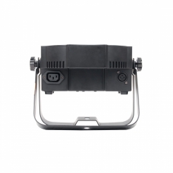 Power en DMX In-/Uitgangen. Zijn op de zijkant van het apparaat gemonteerd zodat de unit plat op de vloer of in een truss kan worden geplaatst
